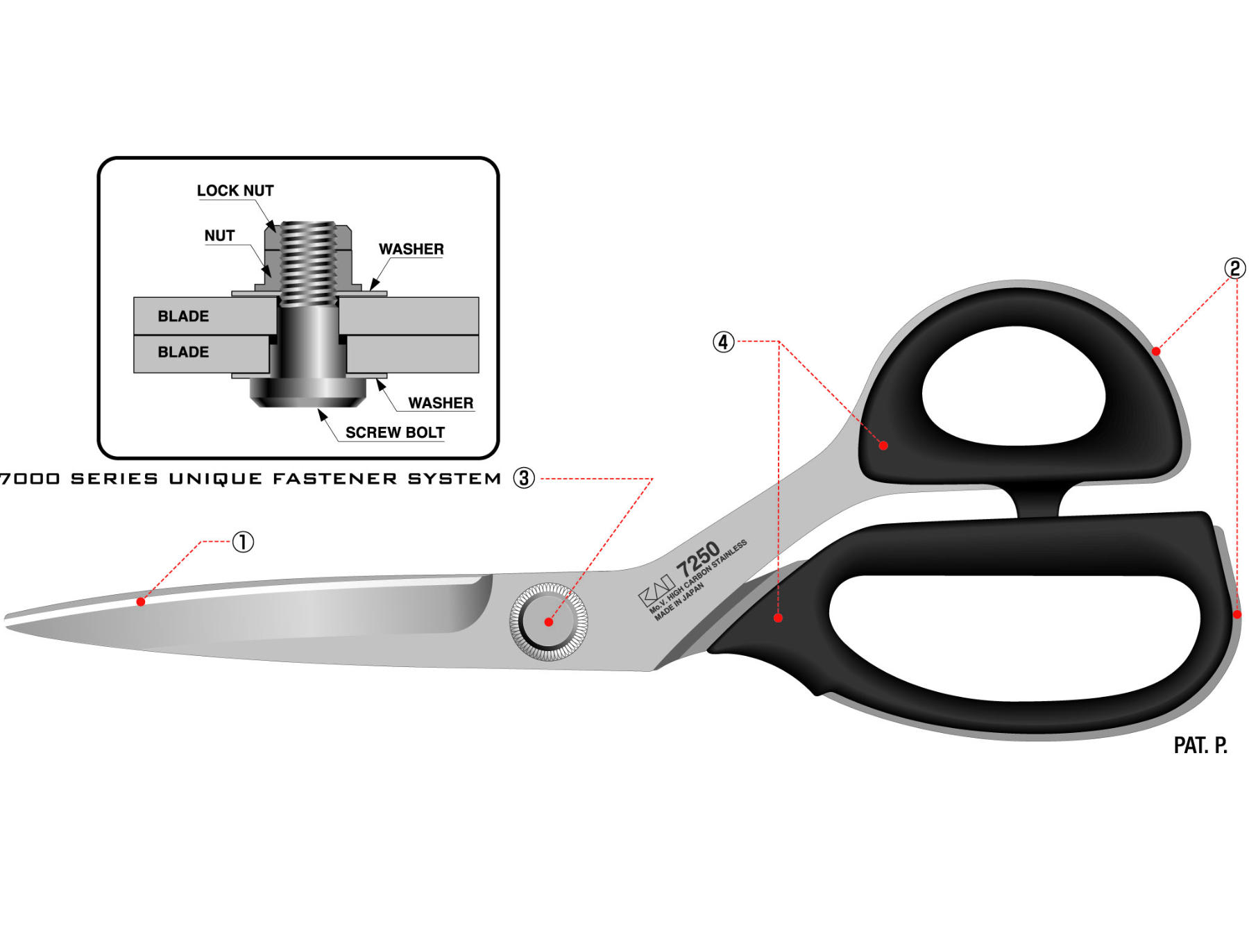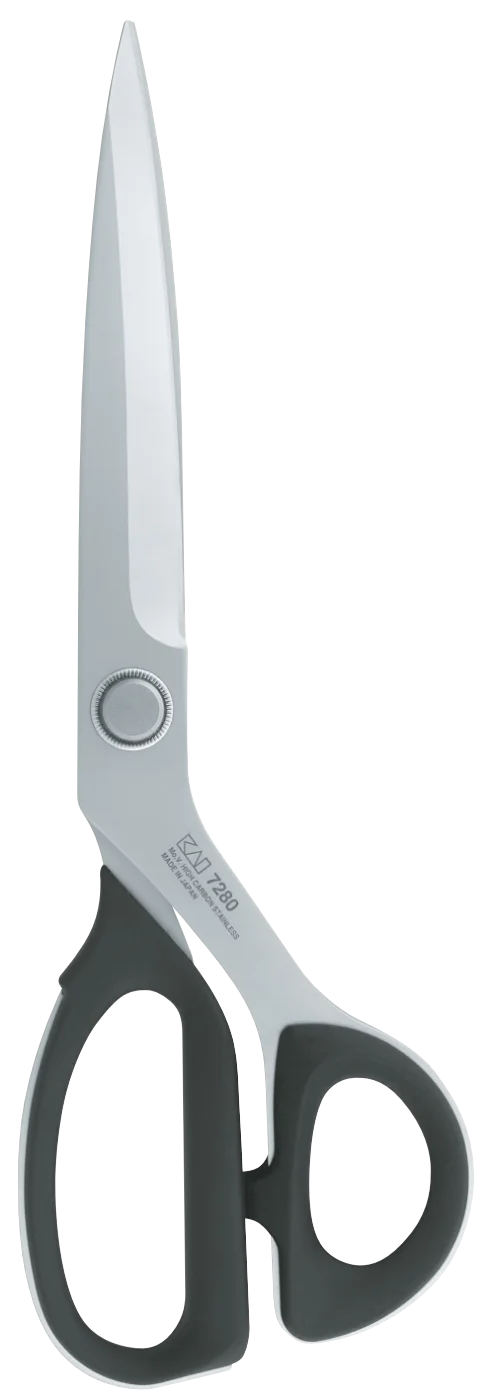 Die Allround-Schneiderscheren der KAI 7000 Serie sind von höchster Güte und absolute Profischeren. Die Scherenblätter der 7280SE Allroundschere mit Mikroverzahnung 28 cm bestehen aus rostfreiem AUS8A-Edelstahl mit einer Härte von 58 HRC und einer Stärke von 3,7 bis 4 mm. Damit sorgen sie für eine hohe Schneiden-Standzeit und optimale Schneidfähigkeit. Die neuartige Doppel-Mutter (Justierschraube) sorgt für eine bleibende Schneidenspannung. Der durchgehende "Blatt-Griff" garantiert eine ausgewogene Schneid-Balance. Und durch die Scherenaugen mit Elastomer Weichplastik-Griffpolstern entsteht ein hoher Schneidkomfort. Die Oberfläche der Schere ist mattiert.