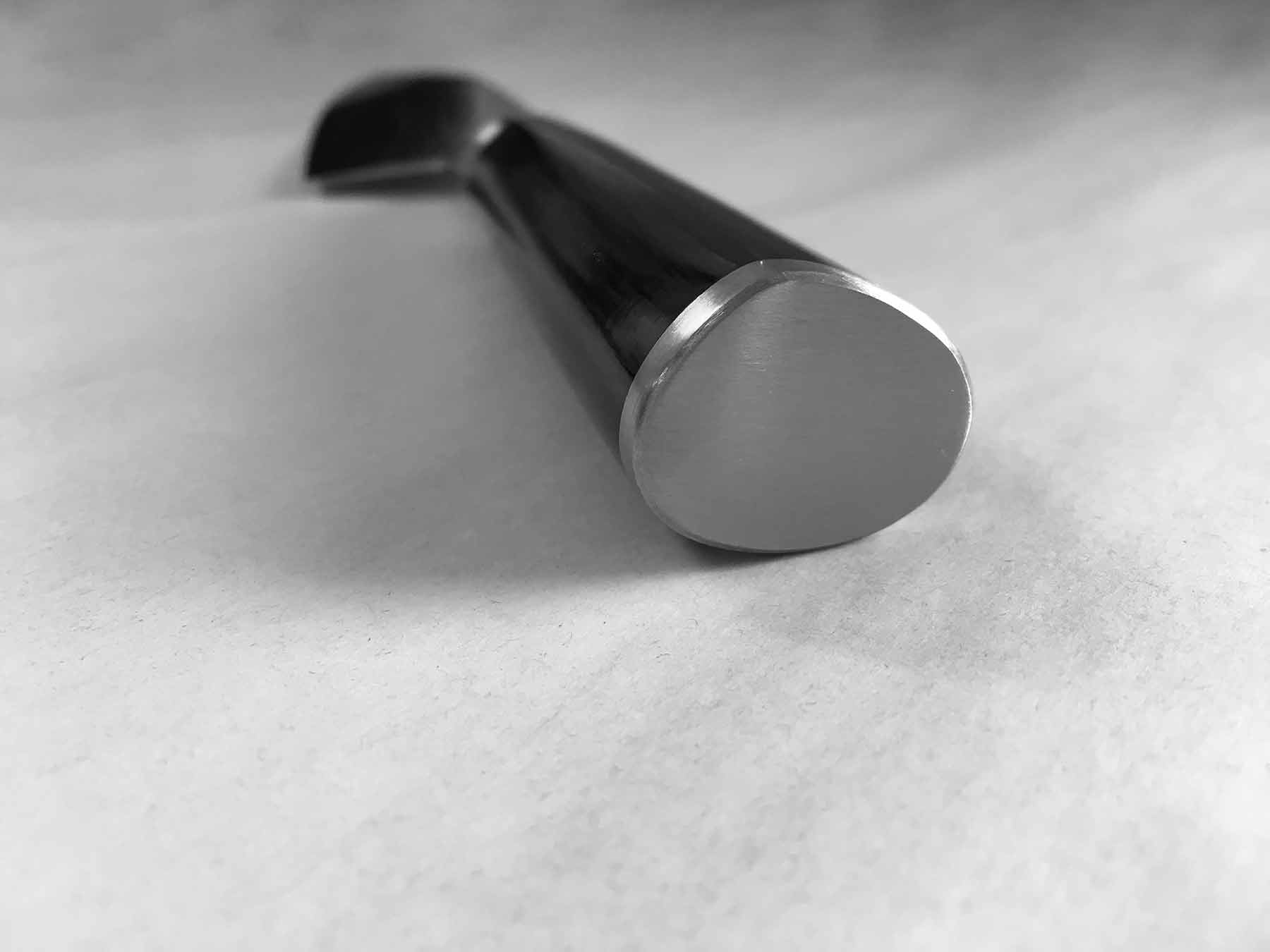 Der Griff besteht aus Pakkaholz, das durch den Zusatz von Harzen besonders robust und feuchtigkeitsbeständig ist. Er ist in traditioneller Kastanienform gefertigt und bietet durch seine ergonomische Gestaltung einen sicheren Halt. Der durchgehende Erl sorgt zusätzlich für Stabilität und Balance.