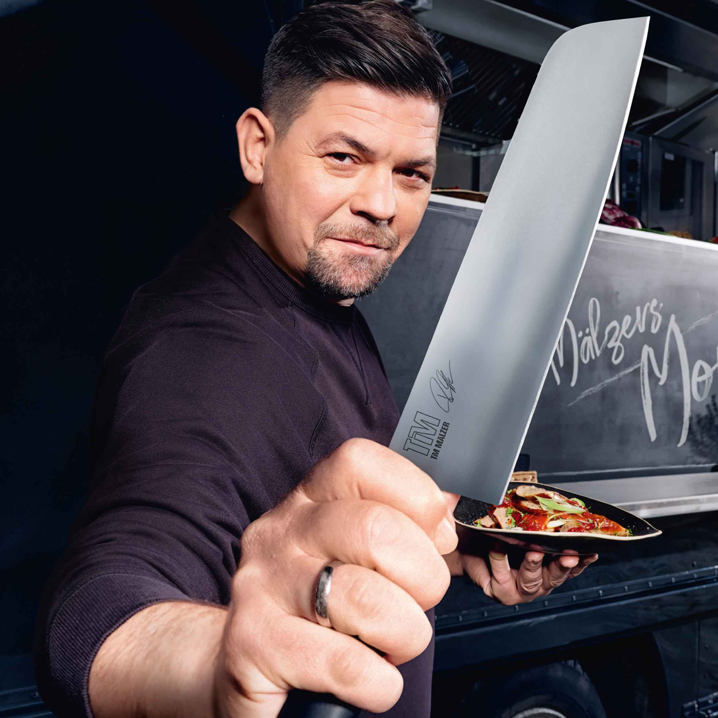 Die Klingen bestehen aus rostfreiem 4116 Edelstahl, sind korrosionsbeständig und besitzen eine Härte von ca. 56 ±1 HRC. Ein edles, satiniertes Finish unterstreicht die schlichte Eleganz. Jede Klinge trägt zudem das Tim Mälzer Logo sowie seine persönliche Signatur, die der Serie ihre unverwechselbare Identität verleihen.