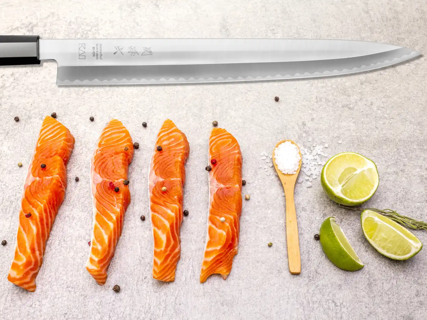Die Schneide besteht aus rostfreiem 8A solid Carbonstahl mit einer Härte von ca. 58 ±1 HRC. Durch den einseitigen Schliff wird eine maximale Präzision erreicht, wie sie für die Zubereitung von rohem Fisch unerlässlich ist. Das Klingenfinish ist mit einer dezenten, wellenförmigen Satinierung versehen, die den hochwertigen Charakter der Serie unterstreicht und optisch an japanische Tradition erinnert.