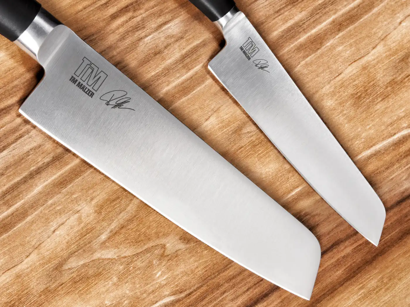 Die Klingen bestehen aus rostfreiem 4116 Edelstahl, sind korrosionsbeständig und besitzen eine Härte von ca. 56 ±1 HRC. Ein edles, satiniertes Finish unterstreicht die schlichte Eleganz. Jede Klinge trägt zudem das Tim Mälzer Logo sowie seine persönliche Signatur, die der Serie ihre unverwechselbare Identität verleihen.