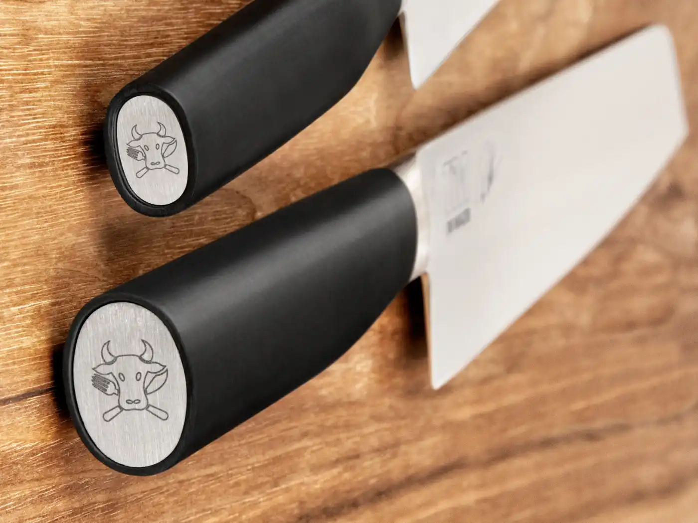 Der ergonomisch geformte Griff aus poliertem POM-Kunststoff ist symmetrisch gestaltet und eignet sich für Rechts- wie auch Linkshänder gleichermaßen. Er liegt angenehm in der Hand und bietet sicheren Halt auch bei längeren Schneidarbeiten. Die ausgewogene Balance zwischen Griff und Klinge sorgt für leichtgängiges, agiles Arbeiten. Am Griffende befindet sich als raffiniertes Detail das Küchenbullen-Emblem von Tim Mälzer – ein dezentes Markenzeichen mit hohem Wiedererkennungswert.