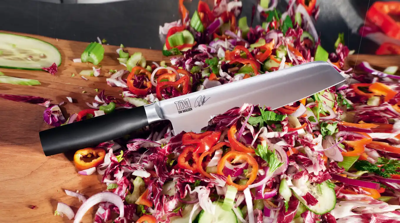 Die Klingen bestehen aus rostfreiem 4116 Edelstahl, sind korrosionsbeständig und besitzen eine Härte von ca. 56 ±1 HRC. Ein edles, satiniertes Finish unterstreicht die schlichte Eleganz. Jede Klinge trägt zudem das Tim Mälzer Logo sowie seine persönliche Signatur, die der Serie ihre unverwechselbare Identität verleihen.