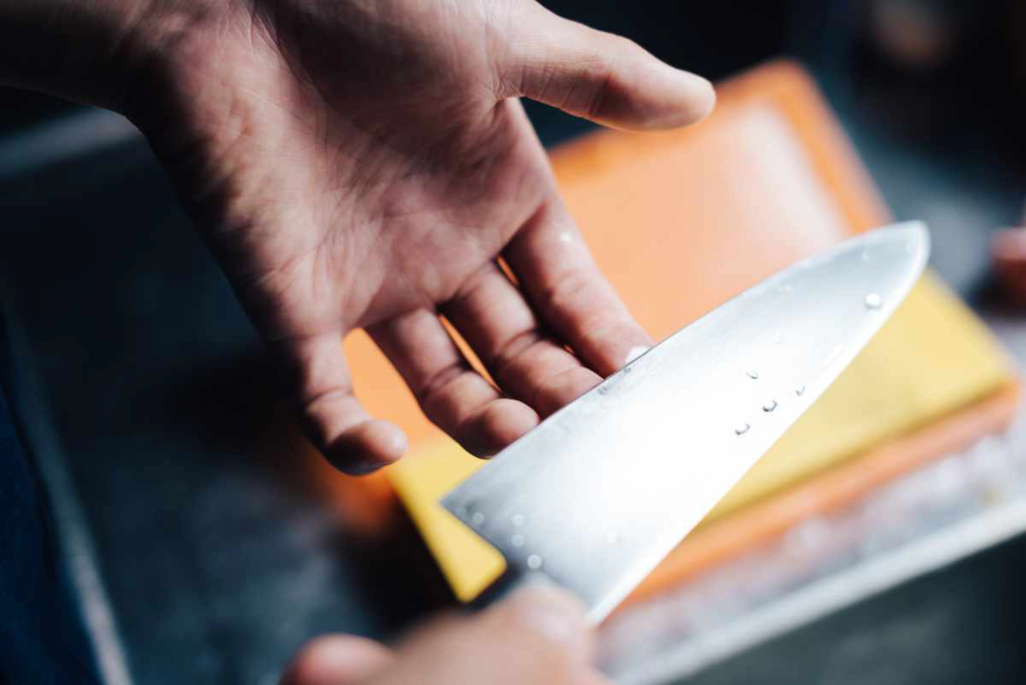 Die Messer werden nass über mehrere drehende Korundsteine mit unterschiedlichen Körnungen geschliffen. Anschließend erfolgt der Feinschliff über einen feinen "klassischen" japanischen Wasserschleifstein sowie eine Feinpolitur der Schneide.