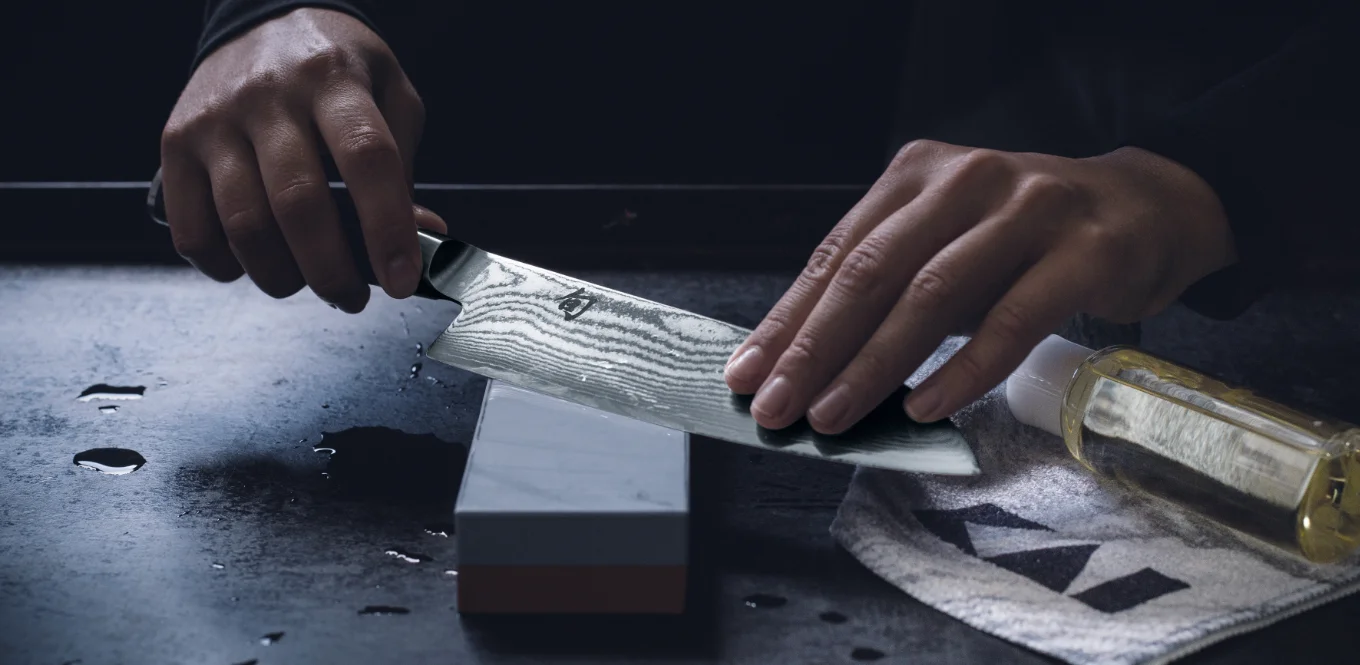 Die hochwertigen KAI-Messer sollten regelmäßig geschärft und gepflegt werden, z.B. mit einem Schleifstein. Dieser besteht in der Regel aus einzelnen Schleifkörnern und einem Bindemittel, z.B. Aluminiumoxid. Wird der Stahl eines Messers über den Schleifstein gezogen, zerbrechen die Schleifkörner und hinterlassen neue scharfe Kanten, die die Klinge schärfen. Die Körnung des Schleifsteines gibt an, für welchen Einsatz er am besten geeignet ist. Je höher die Körnung ist, desto kleiner sind die Schleifkörner. Mit einer Körnung von 3000 lassen sich z.B. gut Feinarbeiten erledigen. Eine Körnung bis 400 eignet sich dagegen für besonders stumpfe Messer. Wichtig: Messer mit Wellen- oder Sägeschliff können nicht mit einem Schleifstein geschliffen werden.
