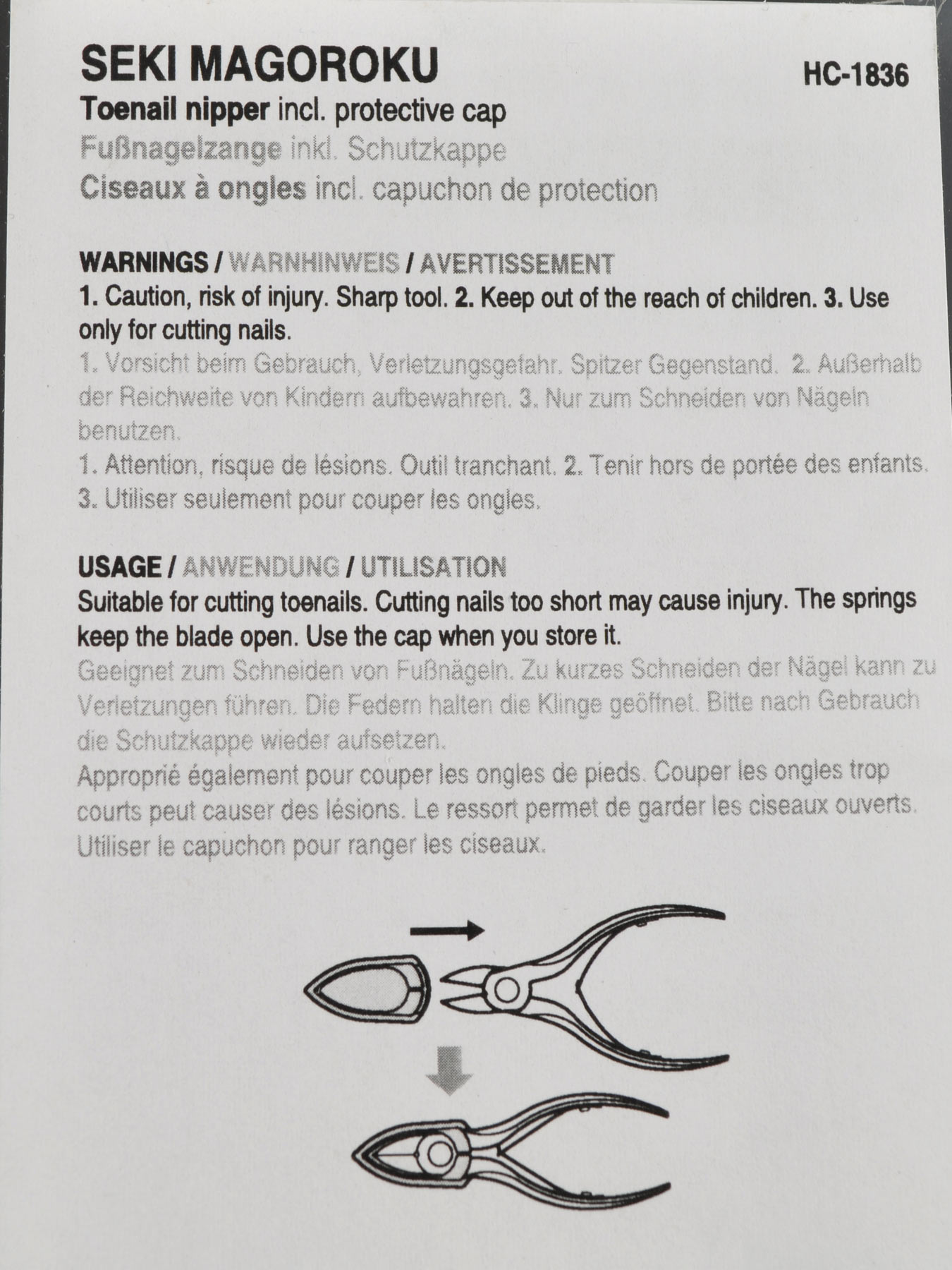 Die Fußnagelzange ist geeignet zum Schneiden von Fußnägeln. Zu kurzes Schneiden der Nägel kann zu Verletzungen führen. Die Federn halten die Klinge geöffnet. Bitte nach Gebrauch die Schutzkappe wieder aufsetzen.