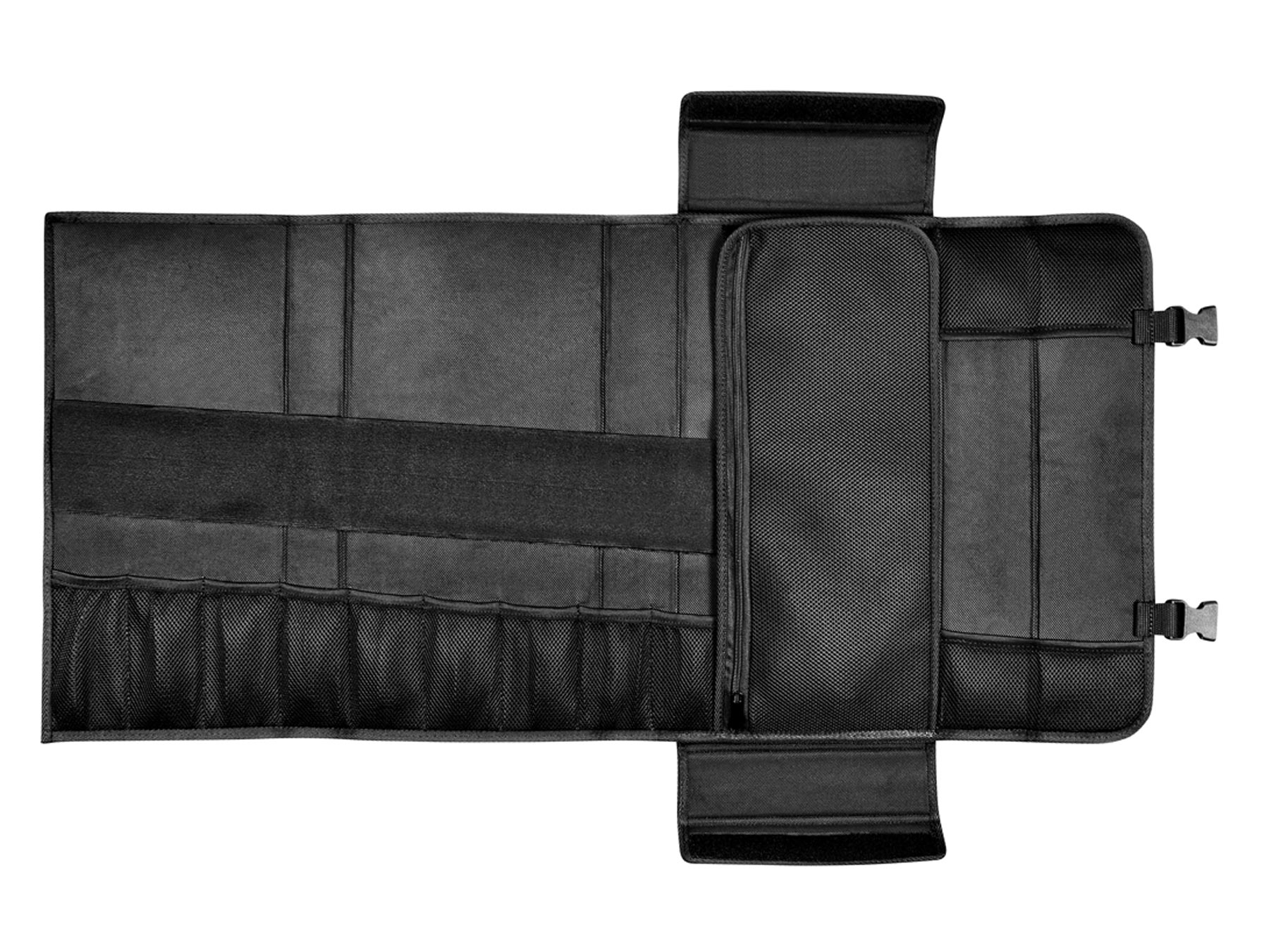 Die Shun-Messertasche ist der ideale Aufbewahrungsort für Messer, besonders für den Profikoch unterwegs. In ihr finden neun große Messer, acht kleine Messer und weiteres Zubehör Platz. Außerdem gibt es ein separates Fach für Schleifsteine. Die Tasche ist leicht zu säubern und wird mit einem Trageriemen geliefert. Farbe: grau
