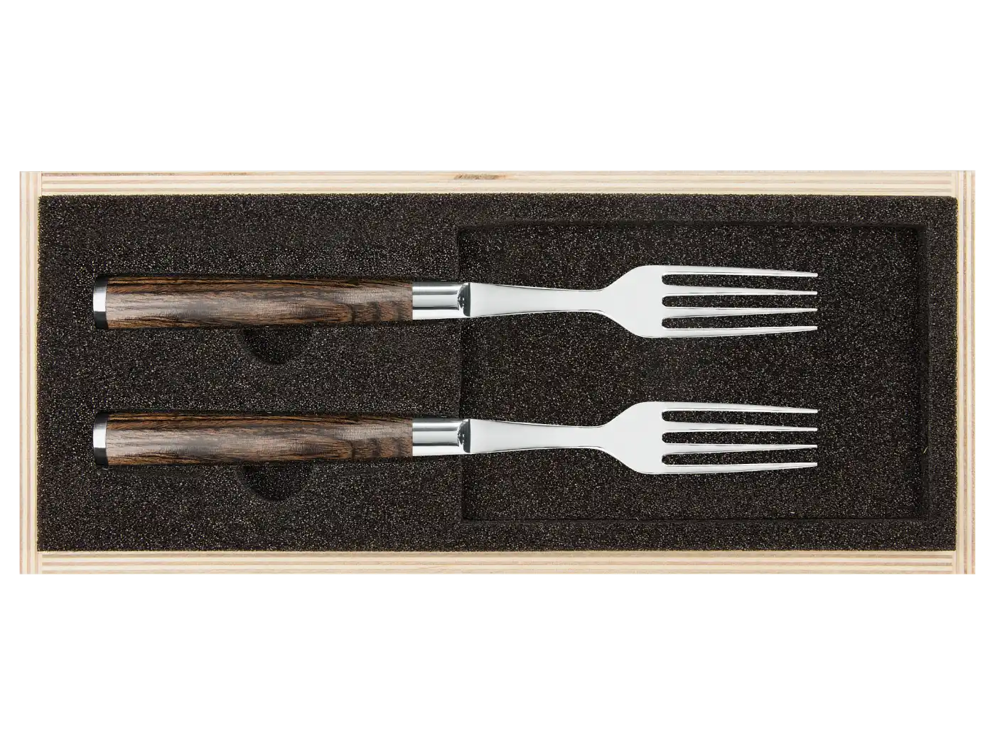 Das KAI Shun Premier TDM-0990 Besteckset umfasst zwei aus Edelstahl gefertigte Gabeln, die optisch und ergonomisch auf die Messer der Shun Premier Serie abgestimmt sind. Geschmiedete Ausführung, made in Japan. Die symmetrische Griffform aus hochwertigem Walnussholz liegt ausgewogen in der Hand und verleiht dem Besteck eine sachliche Eleganz. Gesamtlänge 21 cm, Grifflänge 10,5 cm und ein Gewicht von 53 g.