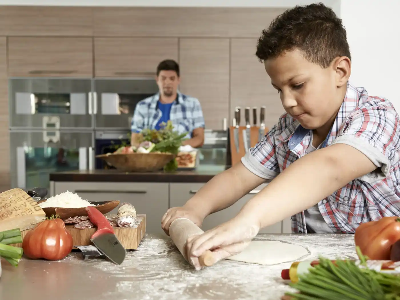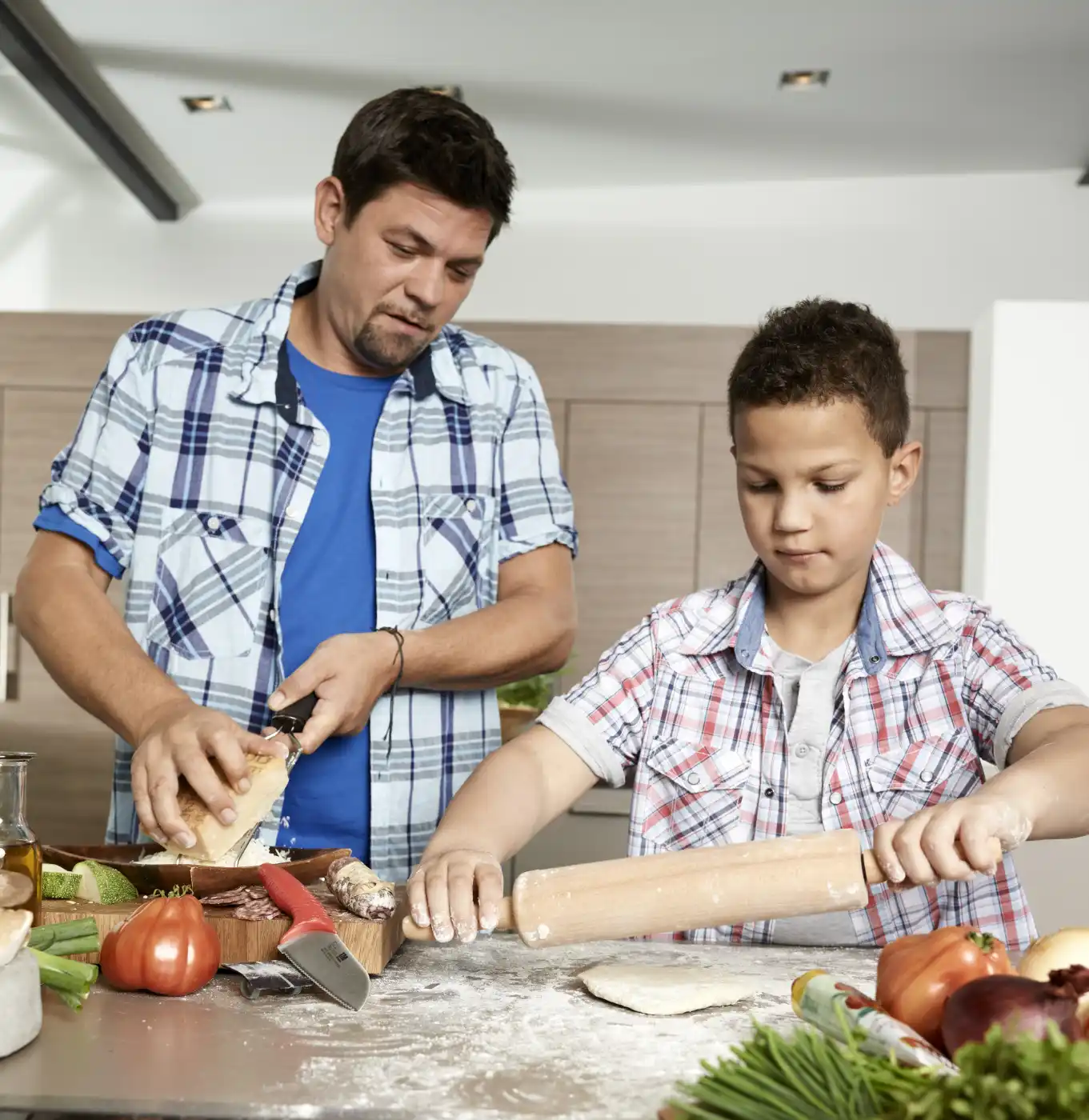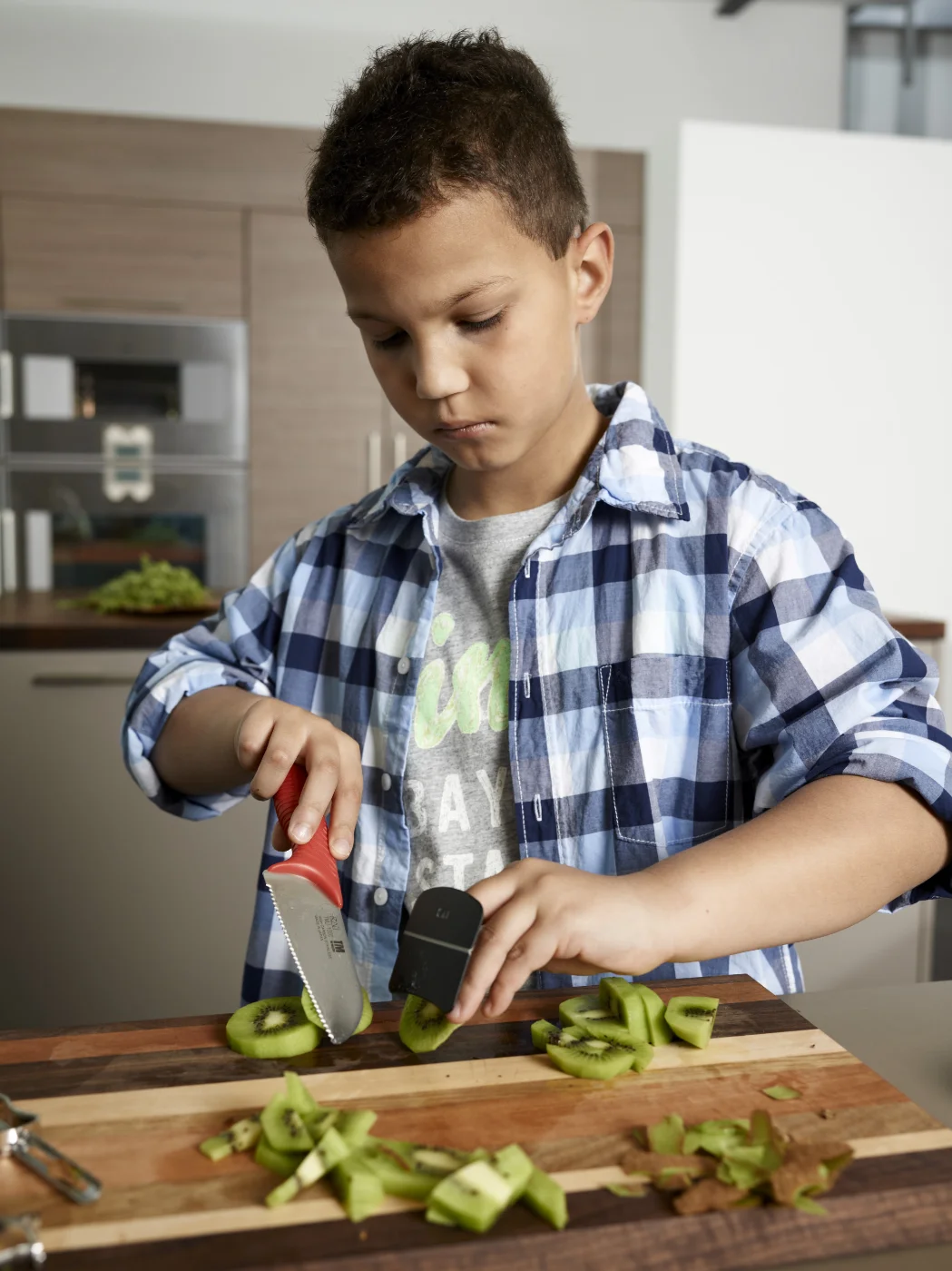 Das KAI Tim Mälzer Junior Kochmesser wurde gemeinsam mit Tim Mälzer speziell für Kinder ab 6 Jahren entwickelt, um ihnen den sicheren Umgang mit Messern beim gemeinsamen Kochen zu ermöglichen. Da Kinder Schneidbewegungen meist intuitiv mit einer Art Sägebewegung nachahmen, ist die Edelstahlklinge des Junior Messers mit einem feinen Wellenschliff versehen. Dieser reduziert den Kraftaufwand und minimiert die Gefahr des Abrutschens. Zusätzlich sorgt eine abgerundete, stumpfe Klingenspitze für noch mehr Sicherheit beim Schneiden.